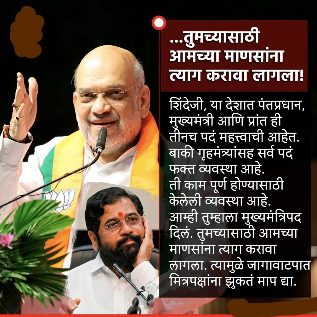 काय म्हणाले अमित शाह? “शिंदे जी, या देशात पंतप्रधान, मुख्यमंत्री आणि प्रांत ही तीनच पदं महत्त्वाची आहेत. बाकी गृहमंत्र्यांसह सर्व पदं फक्त व्यवस्था आहे. ती काम पूर्ण होण्यासाठी केलेली व्यवस्था आहे. आम्ही तुम्हाला मुख्यमंत्रिपद दिलं. तुमच्यासाठी आमच्या माणसांना त्याग करावा लागला. त्यामुळे जागावाटपात मित्रपक्षांना झुकतं माप द्या.”अजित पवारांचा राष्ट्रवादी पक्ष हा महायुतीच्या माध्यमातूनच विधानसभा निवडणूक लढवणार आहे. त्यामुळे अजित पवारांना सत्तेत सामील होताना भाजपने जो शब्द दिला आहे तो शब्द पाळणार असल्याची माहिती आहे. त्याचमुळे आता भाजप नेते अमित शाहांनी स्वतः जागावाटपामध्ये सक्रिय भूमिका घेतली आहे. मुख्यमंत्रिपद हे शिंदेंकडे आहे, त्यामुळे मित्रपक्षांना त्यांनी जास्तीत जास्त जागा द्याव्यात असा आग्रह आता भाजपकडून केला जात आहे.